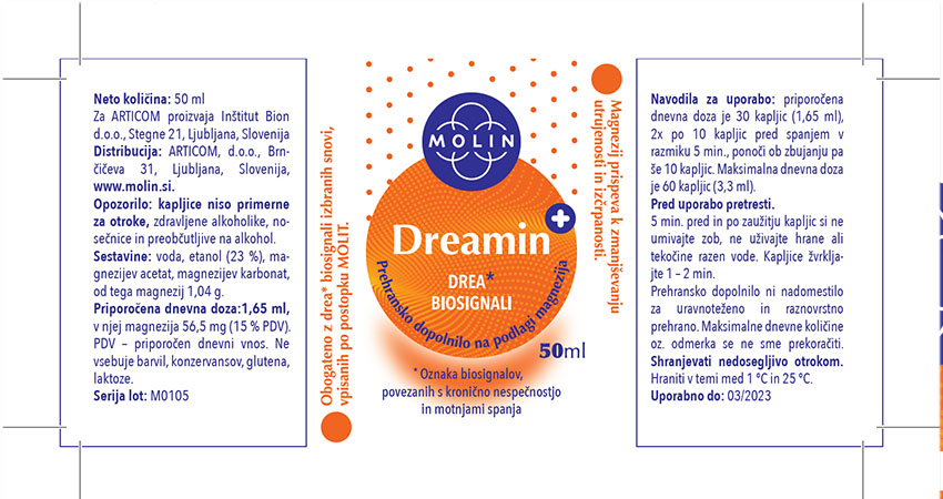 Dobrodejni učinek dosežete že z zaužitjem 2 krat po 10 kapljic Dreamina+ neposredno pred spanjem v razmiku 5 minut. Ko zaužijete prehransko dopolnilo in ga nekaj časa zadržujete v ustih, najbolje z žvrkljanjem, se prične odvijati absorpcija magnezija in biosignalov. Sledi zgoraj opisana reakcija organizma v smeri globlje sproščenosti in pomirjanja. Organizmu je ponovno odprta pot v mirno spanje. Ponoči ob morebitnem zbujanju zaužijte še 10 kapljic Dreamina+. Stabilizacija učinka Dreamina se normalno doseže po 1 mesecu rednega jemanja.